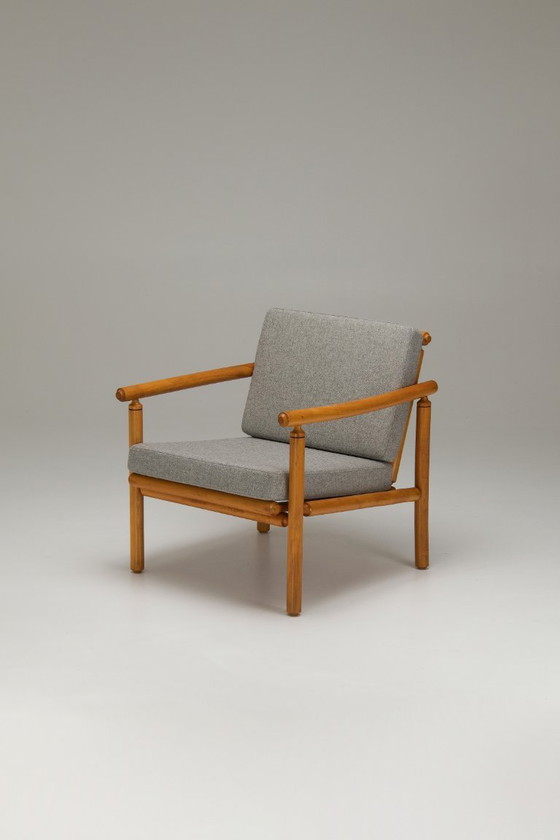 Dit is een Deense stoel in koloniale stijl, vermoedelijk uit de jaren 50. Het beukenhouten frame is opgebouwd uit gedraaide en afgeronde houten elementen. De zit- en rugkussens zijn opnieuw bekleed met een lichtgrijze stof. Het algehele ontwerp kenmerkt zich door eenvoudige, lineaire vormen gecombineerd met zacht afgeronde details, typisch voor meubels in koloniale stijl.