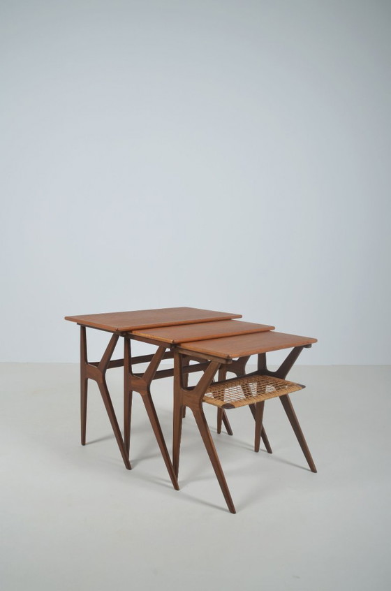 Set van 3 Deense nesttafels ontworpen door Johannes Andersen. Deze werden vervaardigd in de jaren '60 door het meubelbedrijf C. F. Christensen Silkeborg.