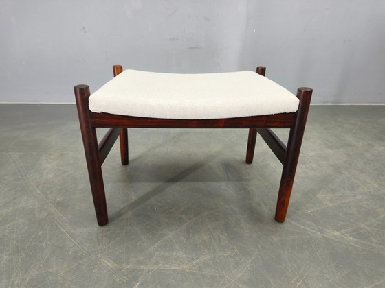 Deense poef uit het midden van de 20e eeuw, geproduceerd door Spottrup in de jaren 60. Dit elegante meubelstuk is een toonbeeld van Scandinavisch modern vakmanschap met zijn sculpturale frame van massief palissanderhout en verfijnde proporties.