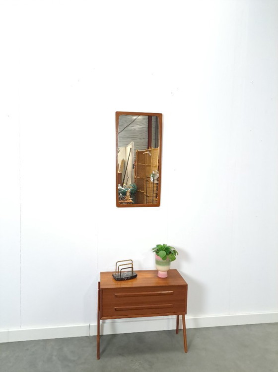 Vintage set uit Denemarken. De set bestaat uit een ladekast en bijpassende spiegel. Ideaal om te gebruiken in een hal of slaapkamer. De ladekast is uitgegeven door AP Mobler en heeft een goed ontwerp door de stijlvolle poten en twee lades met mooie handgrepen.