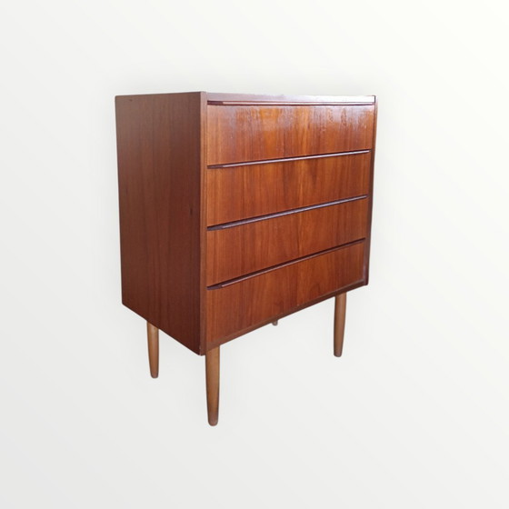Deense vintage ladekast met 4 schuiflades voorzien van geïntegreerde hardhouten handgrepen. De kast staat op conische poten.