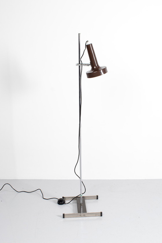 Deense vintage vloerlamp uit de jaren zeventig met richtbare spot gemaakt van bruin gespoten aluminium.Wat kleine sporen van gebruik en corrosie van het chroom maar verder in een goede vintage staat.