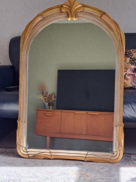 Geweldige grote DeKnudt spiegel, art nouveaux in stijl. Gelaagde rand die verloopt in kleur. 2 hele minimale krasjes op het glas. Niet storend. Minimale gebruikssporen aan de rand.