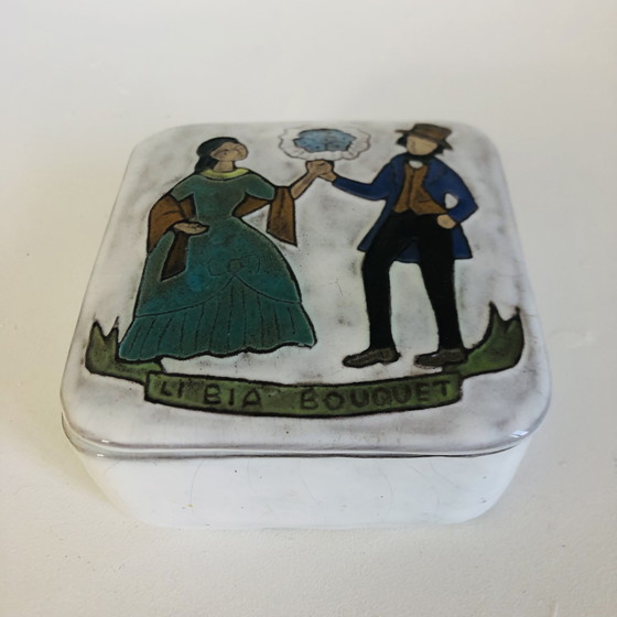 Voorstelling van een jong stel dat elkaar bloemen aanbiedt, "li bia bouquet", wat "mooi boeket" betekent in het Waals. Een huwelijks- of verlovingsobject.