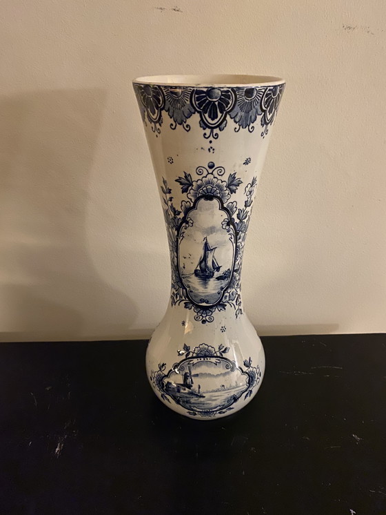 Deze prachtige Delftsblauwe vaas is een toonbeeld van de tijdloze elegantie van Nederlands vakmanschap. Met een hoogte van 32 cm is de vaas versierd met verfijnde blauwe bloemmotieven en serene landschapsscènes, die de essentie van klassiek Delfts aardewerk perfect weergeven.