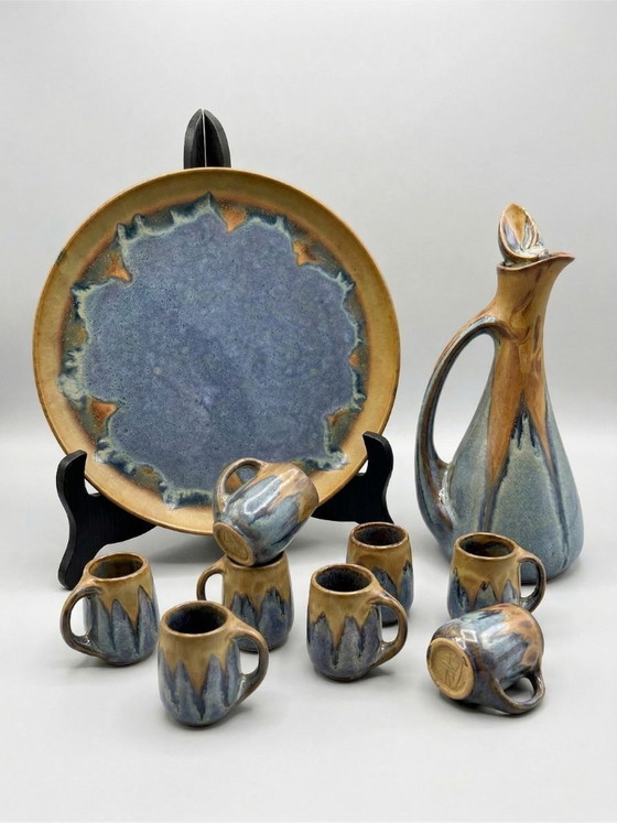 Een schitterende likeurset van steengoed van Denbac, een toonbeeld van naoorlogs Frans keramiek.