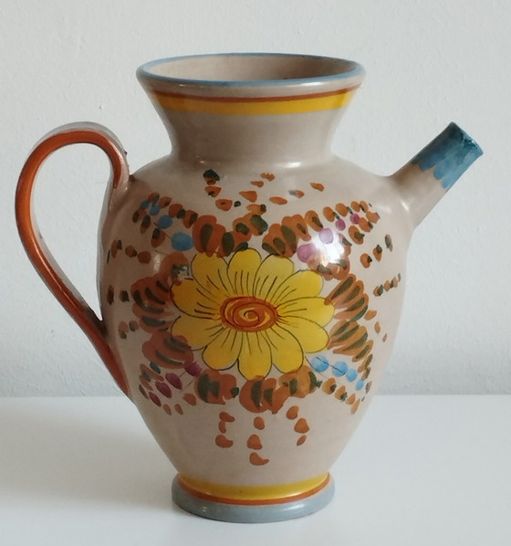 Deze Deruta/Italiaanse lentekan/karaf heeft zijn hoge en lage randen, zijn schenktuit (alleen in blauw) en zijn handvat versierd in deze prachtige blauwe, gele en bruine kleuren. Authentiek.