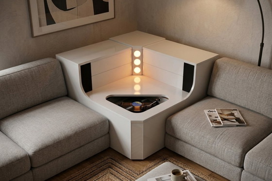 Naast een perfect oppervlak voor drankjes of boeken, is de hoekbank voorzien van een ingebouwd geluidssysteem met draaitafel, waardoor uw woonkamer verandert in een waar entertainmentcentrum met een retro-futuristische uitstraling.