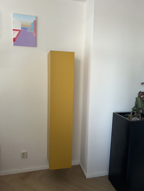 Design kast in een mosterdgele kleur met een antracietkleurige binnenkant. De kast heeft een moderne uitstraling door de push-to-open deur: dus geen zichtbare grepen.
