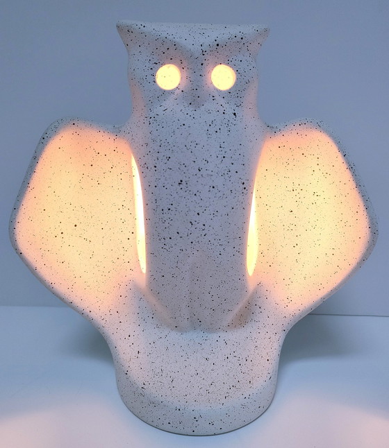 design sfeerlamp met uil figuur. wit keramiek met zwarte spikkels. frans werk uit de jaren 80. zeer goede staat. totale hoogte 23 cm. totale breedte 20 cm. werkt met een klein meegeleverd schroeflampje.