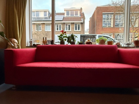Ruime Design on stock bank, 3 zits, 237 cm breed. De bank heeft een stevige comfortabele zit. De stof is aan vervanging toe. De stoffering is eenvoudig te vervangen; de stof heeft een rits aan de achterzijde.