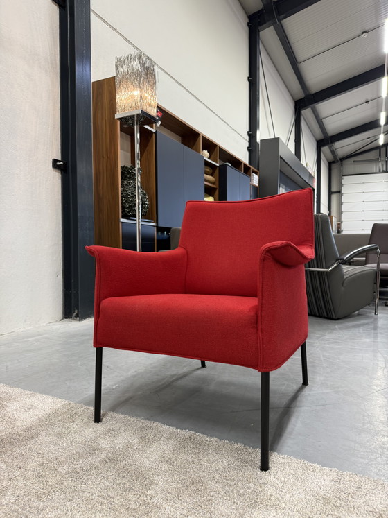 Design on stock limec fauteuil uitgevoerd in wolstof in de kleur rood. Nieuwprijs €1755 afm 73xd72xh84 zh45 nu te koop voor €899