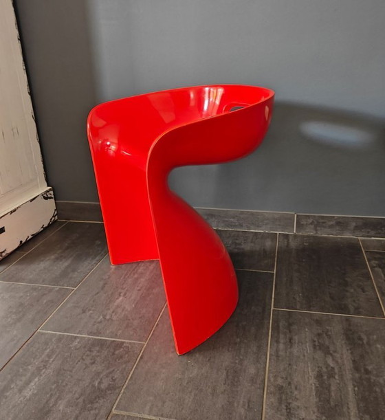 Erg mooie rode design stoel van Winfried Staeb. De stoel doet ook wel denken aan de Panton Chair. De stoel is uit veel ooghoeken een echt kunstwerk.