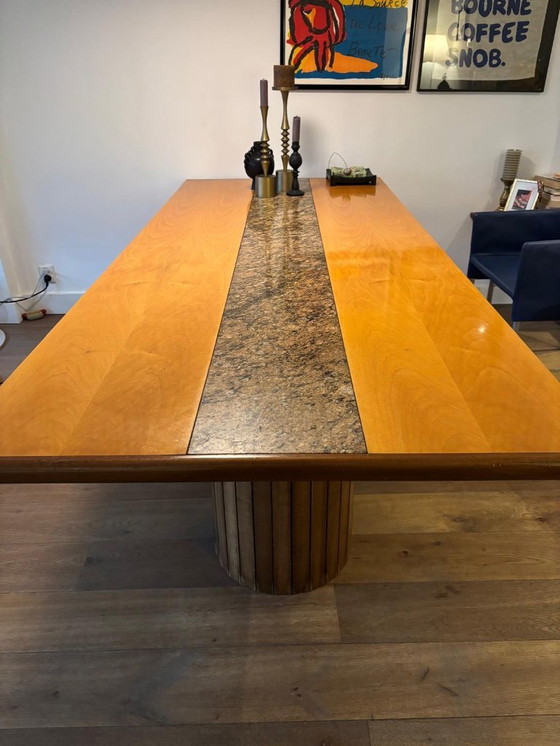 Zeldzame design tafel van het Duitse merk Draenert, model 2020 Cherry Vorland, origineelgekocht in 1993 bij Marian Coenen Interieur (Udenhout). Deze uitvoering combineert warm kersenhout met een centrale inleg van Vorlandgranieten heeft een asymmetrisch onderstel: één cilindervormige poot met verticale lamellen en één slank paneelvormig steunvlak een configuratie die niet meer wordt geproduceerd.