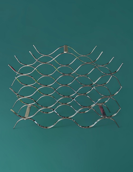 Stijlvol en modern wijnrek gemaakt van hoogwaardig metaal, geschikt voor het opbergen van 17 flessen. Het rek heeft een elegant golvend ontwerp dat zowel functioneel als decoratief is. Perfect voor wijnliefhebbers die hun collectie op een georganiseerde en esthetische manier willen presenteren.