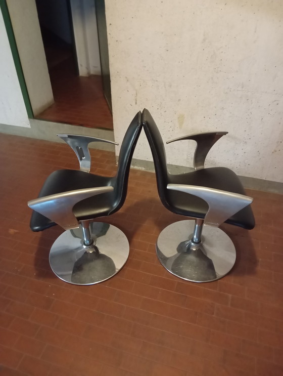 Dompel jezelf onder in de wereld van futuristisch design met deze Space Age stoelen, een waar meesterwerk van vakmanschap en stijl. Deze stoelen zijn gemaakt van hoogwaardig zwart leer en bieden uitzonderlijk comfort en ongeëvenaarde duurzaamheid. Het zilverkleurige metalen frame zorgt niet alleen voor stevigheid, maar voegt ook een vleugje moderne elegantie toe, perfect voor eigentijdse interieurs. De gedurfde, innovatieve lijnen van deze stoelen maken ze ideaal voor wie een vleugje moderniteit en stijl aan zijn ruimte wil toevoegen. Ontdek de aantrekkingskracht van Space Age design en transformeer je ruimte met deze unieke stukken.