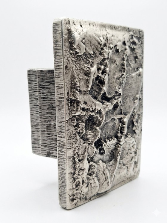 Deze Alpan deurgreep is een prachtig voorbeeld van brutalistische vormgeving, waarbij robuuste esthetiek en functionaliteit samenkomen. Het stuk is vervaardigd uit hoogwaardig metaal en heeft een opvallende zilveren en grijze afwerking die een industriële charme uitstraalt.