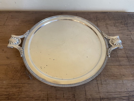 Prachtig silverplated dienblad of presenteerschaal uit Frankrijk. Het dienblad dateerd uit de periode begin 1900. De rand heet de zgn eierlijst en eindigt aan beide kanten in mooi gedecoreerde handgrepen. Het blad staat tevens op kleine pootjes. Super decoratief en sfeervol om alleen al neer te zetten met bv glazen erop of leuke drankflesjes. Diam. : 35.5 cm. Breedte met handvaten: 45 cm. Handvaten hoogte: 4 cm.