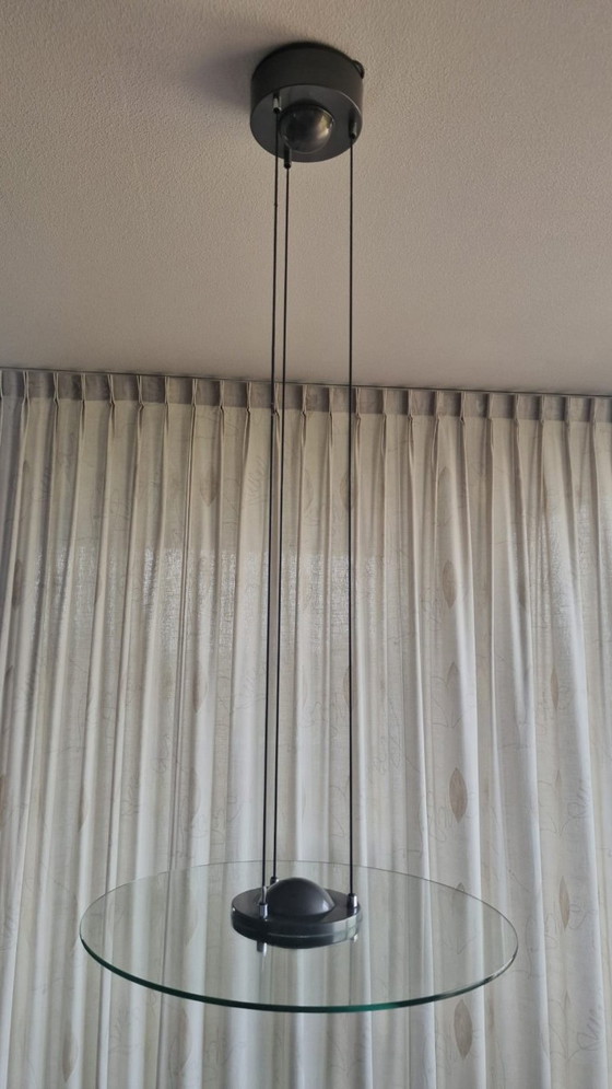 Deze Dijkstralamp van glas en aluminium uit de jaren '90 past nog steeds goed bij een strak modern interieur.