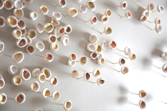Voor deze installatie zijn de meeste elementen bevestigd aan speciale pinnen met grote koppen. Deze pinnen zijn gemakkelijk in een gipsplaat te drukken tot de gewenste diepte. De klei-elementen worden vervolgens aan deze pinnen bevestigd, met enkele extra vormen die op de muur zelf worden aangebracht.