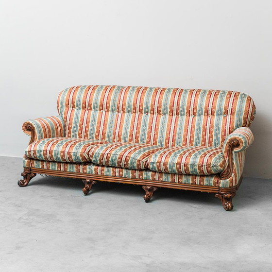 Ga terug in de tijd met deze fantastische vintage 3-zitsbank, rechtstreeks uit de stijlvolle jaren '50! Bekleed met een levendige, veelkleurige gestreepte stof, is dit meubelstuk een echte blikvanger. De houten poten voegen een vleugje elegantie toe, waardoor het perfect past in elke retro-geïnspireerde ruimte.