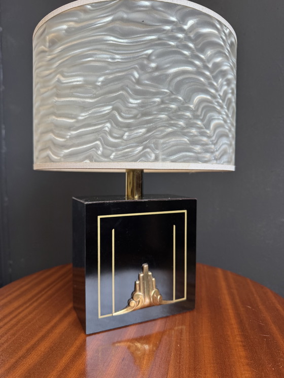 Elegante kleine Le Dauphin lamp uit de jaren 70/80, met een vierkante zwarte fineer voet versierd met een verguld Art Deco-achtig ontwerp en een centraal bronzen element; een transparante cilindrische lampenkap met een mat effect; in zeer goede algehele staat (enkele lichte gebruikssporen); geschikt voor een standaard schroeflamp.