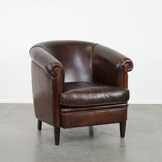 Aangeboden deze stijlvolle en karaktervolle donkerbruine vintage clubfauteuil in Engelse stijl gemaakt van schapenleer met meekleurende biezen.