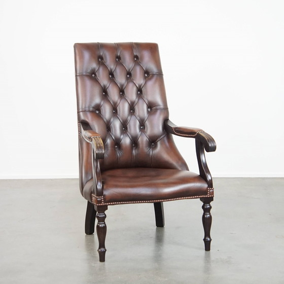 Aangeboden deze luxe, donkere Engelse rundleren en houten chesterfield fauteuil met een hoge rug en sierlijke voorpoten. Deze geweldige chesterfield fauteuil is de perfecte representatie van Engelse klasse en comfort. Hij is gemaakt van rundleer en gecombineerd met hout. Zijn sierlijke voorpoten en correcte afwerking met siernagels zorgen voor net dat extra vleugje elegantie. Deze fauteuil heeft een goed, correct zitcomfort mede door zijn hoge rug. Door jarenlang gebruik heeft hij slechts enkele normale gebruikssporen opgelopen. Structureel is hij in goede en uiteraard direct inzetbare staat. Bij gepast gebruik en onderhoud kunt u nog vele jaren van deze fijne fauteuil genieten. Let op: De afmetingen vermeld in onze advertentie tekst zijn leidend. Foto’s maken deel uit van de omschrijving. Afmetingen: Hoogte: 107 cm Breedte: 65 cm Diepte: 80 cm Zithoogte: 40 cm Zitdiepte: 54 cm Artikelnummer: 10012503
