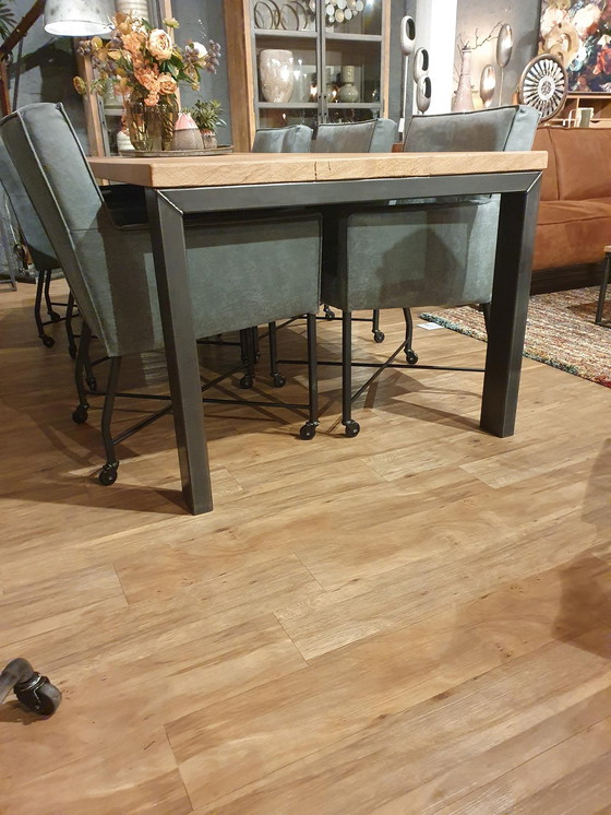 Uitgevoerd in: Eiken blad Poten metaal Afmetingen: Breedte: 100cm Hoogte: 76cm Lengte: 240cm Alle maten zijn circa maten