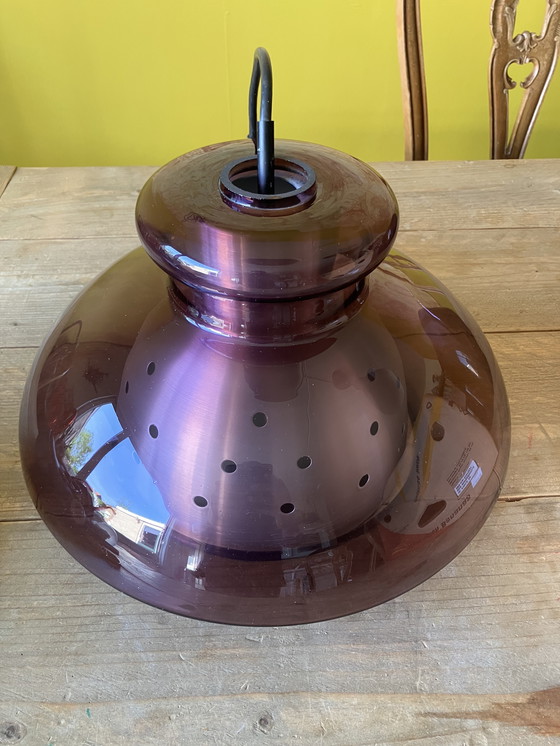 Mooie hanglamp van Doria Leuchten. De bijzondere combinatie van het paarse glas met de geperforeerde binnenkap maakt het een mooi design.