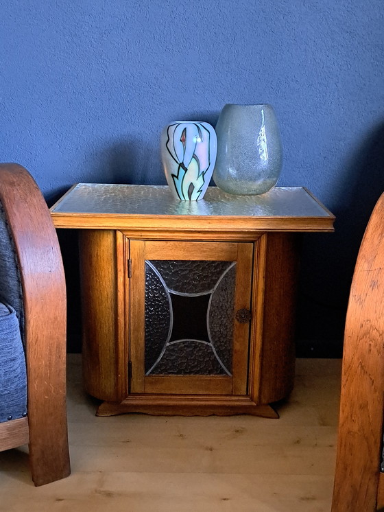 Houten drankenkastje of boekenkastje of wat je maar wilt... Met verlichting! Midcentury... jaren 60... jaren 70. Vintage in ieder geval. Bovenkant is gewolkte glasplaat met verlichting. Deurtje met glas in lood. In redelijk goede staat gezien de leeftijd! Met enig patina.