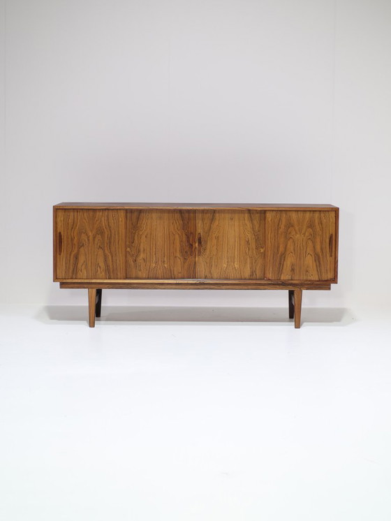 Prachtige laag dressoir / sideboard uit Denemarken, jaren '60. Deze kast is gemaakt van palissanderhout met een bijzondere houttekening. De kast heeft vier schuifdeuren met prachtig vormgegeven handgrepen. Binnenin zitten twee in hoogte verstelbare planken en vijf lades met mooie houtverbindingen. Een minimalistsch design met een verfijnde vormgeving en afwerking. Onder andere geschikt als tv-meubel of platenkast.