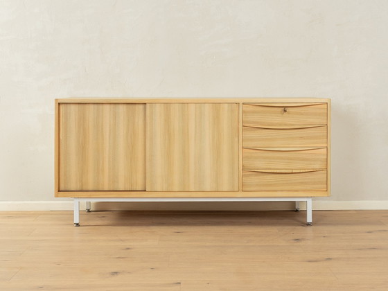 Prachtig halfstevig dressoir in Scandinavische stijl uit de jaren 1950. Corpus in gebleekt walnootfineer met twee deuren, een legplank, vier laden en nieuwe vierkante stalen poten in wit. De zijvlakken zijn bekleed met witte formica. Het ontwerp wordt toegeschreven aan de Bauhaus-student Franz Ehrlich. Gemaakt in Duitsland.