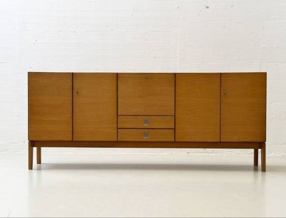 Een Zwitsers naoorlogs modernistisch dressoir met strakke, functionele lijnen. De kast staat op slanke, licht uitlopende poten en heeft vier deuren en twee centrale laden met daarboven een neerklapbaar vak. Daarachter bevinden zich ruime opbergvakken met planken en een barmodule met een plank en spiegel. Discrete metalen handgrepen benadrukken het ingetogen karakter. De houten oppervlakken vertonen een uniforme, fijnmazige nerf met een warme honingkleur. Gemaakt van beukenhout op een kernpaneel, gecombineerd met massief beukenhouten poten.