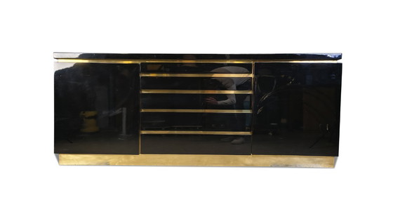 Luxe dressoir in jaren zeventig glamourstijl van Jean-Claude Mahey, bestaande uit zwarte lakpanelen en messing.