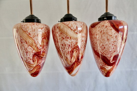Drie Sfeervolle Druppelvormige Hanglampen van Rood Gemarmerd Opaline Glas