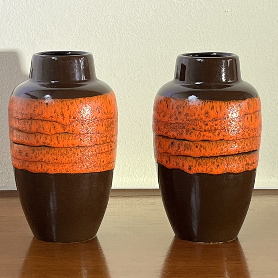 Mooie set Scheurich W-Germany vazen. Modelnummer 549-21 Hoogte 21cm Jaren 70 Basis glanzend bruin met daar overheen een brede band oranje bruis glazuur. De vazen zijn in prima staat. De rechter heeft net wat meer gebruikssporen aan de voet.