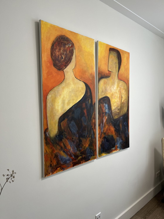 Gestileerd schilderij bestaande uit twee afzonderlijke exemplaren die bij elkaar horen. Gemaakt door Toos de Booij uit Bergen op Zoom.