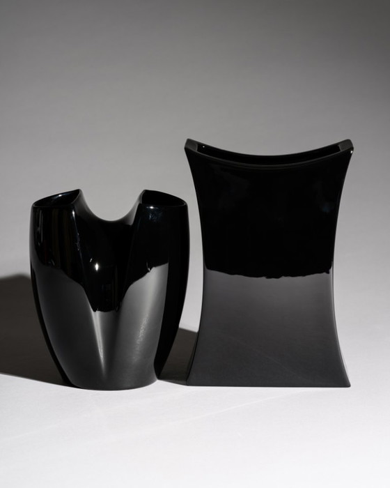 Beschrijving: Sculpturaal duo van zwarte porseleinen vazen van Jan van der Vaart en Platt & Young voor Rosenthal, dat twee sterk verschillende silhouetten combineert in één verfijnde monochrome compositie. De ene vaas is facetvormig en architectonisch, de andere zachter en meer biomorfisch, samen vertegenwoordigen ze de gedurfde postmoderne richting van Rosenthal designporselein.