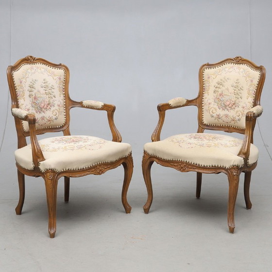 Een paar antieke houten fauteuils in Lodewijk XV-stijl met rococo-uitvoering, daterend uit 1950-1960.