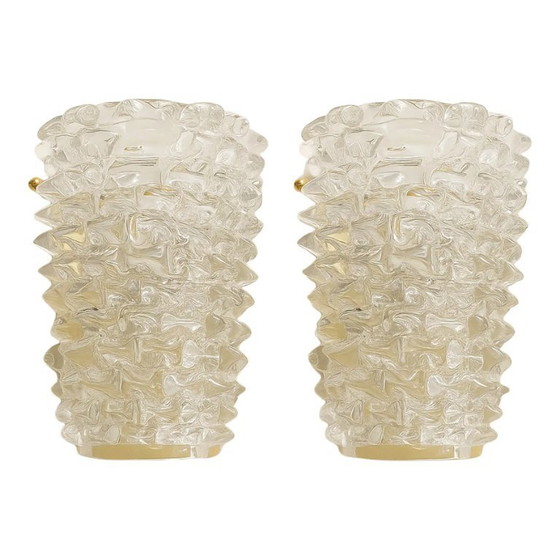 Elegant paar Italiaanse wandlampen, vervaardigd van helder rostrato Muranoglas, een techniek die oorspronkelijk door Barovier is ontwikkeld en bekend staat om zijn lichtreflecterende textuur. De messing structuur behoudt zijn natuurlijke patina, terwijl de elektrische componenten in enkele weken volledig zijn gerestaureerd met E12-lampen.