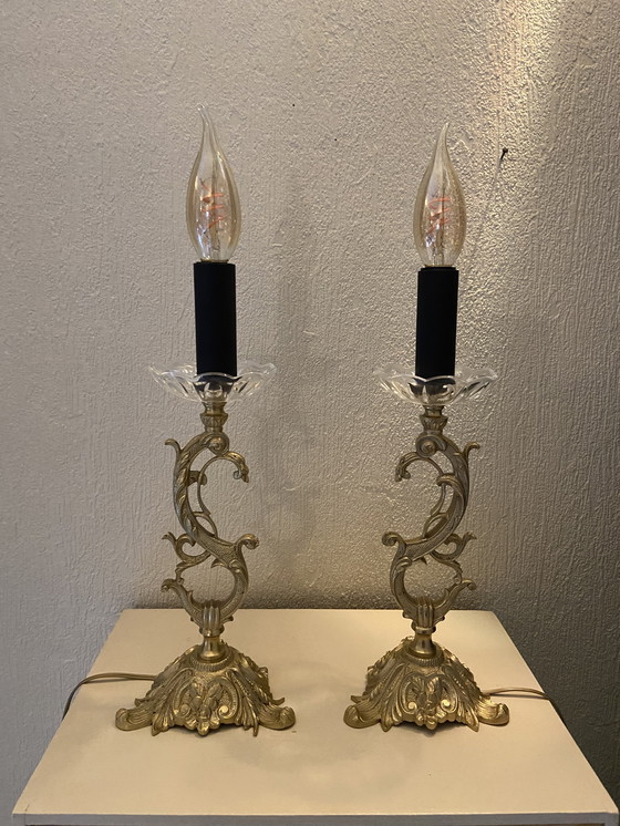 Een paar bronzen kandelaars met kristallen kaarsenhouders, omgebouwd tot lampen.