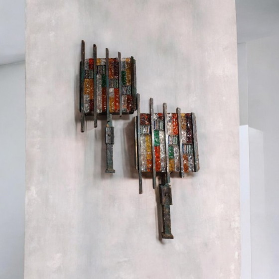 Een paar brutalistische wandlampen van Murano-glas uit de jaren 1960.