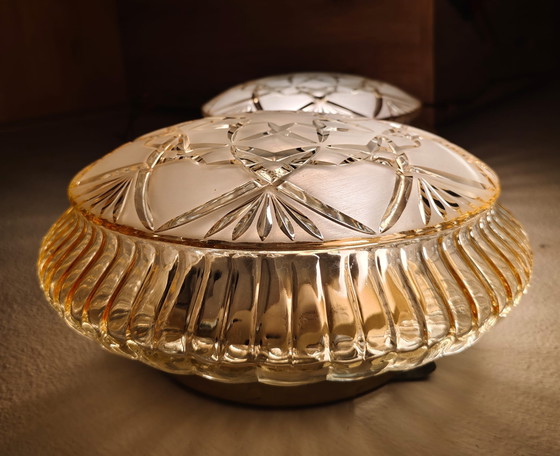 Ervaar de tijdloze elegantie van deze hoogwaardige vintage wand- of plafondlampen van loodkristal met hun verfijnde stervormige slijping. Deze lampen combineren klassieke schoonheid met functionele verlichting en zijn een ware blikvanger in elke ruimte. Hun verfijnde ontwerp en voortreffelijke vakmanschap maken ze tot een ideaal accessoire voor stijlvolle woonruimtes.