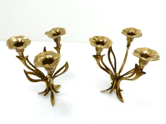 Een paar drielichts kandelaars op drie poten van verguld messing, met een organische bloemversiering geïnspireerd op de aronskelk. Handgemaakt in Europa, circa 1960-1970, in goede algehele staat met originele patina. Worden samen verkocht.