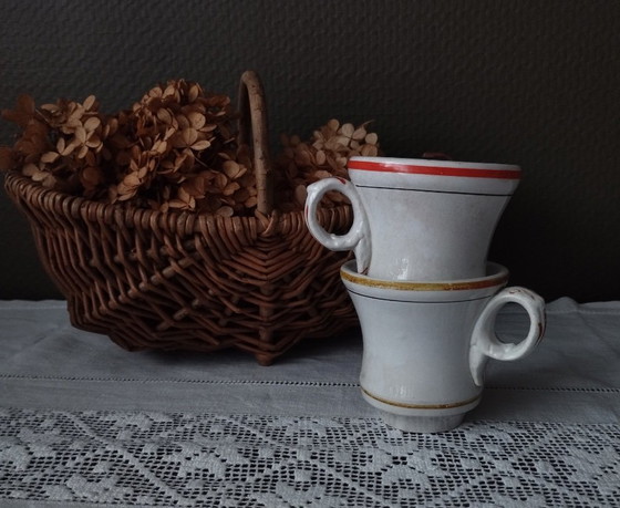 Charmante antieke "brûlot" koffiekopjes van licht gepatineerd porselein, met oranje en zwart beschilderde randen en mooie dolfijn-/visvormige handvatten.