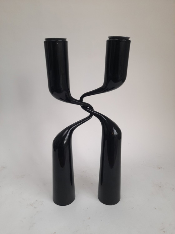 Deze twee in elkaar verstrengelde kandelaars, genaamd Tango, zijn een klassieker in Scandinavisch design. Ontworpen door Mikaela Dorfel voor Menu. Lichte gebruikssporen. Gesigneerd op de voet. Zwarte uitvoering.