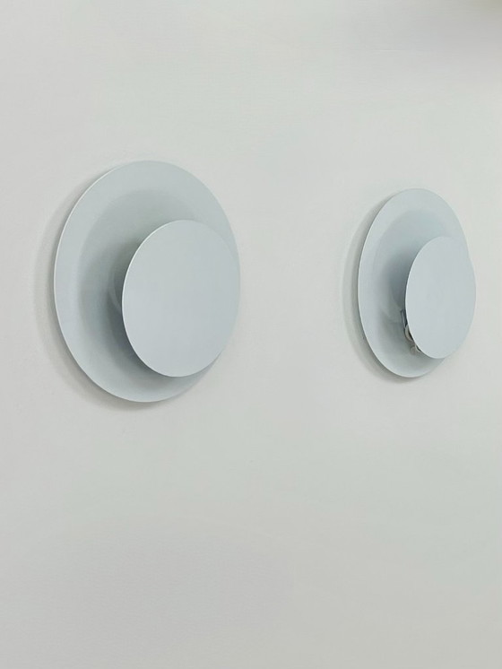 Een paar witte, gelakte metalen wandlampen, geproduceerd in Zweden in de jaren 70.