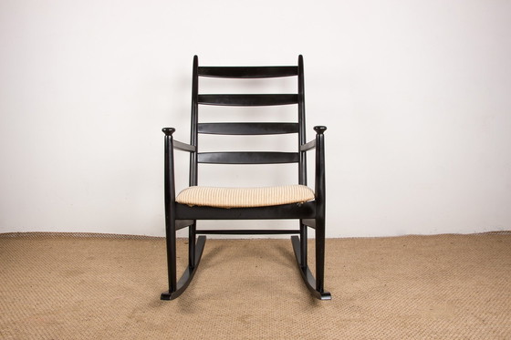 Schommelstoel Scandinavisch. Comfortabele en zeer elegante schommelstoel, twee knoppen versieren de armleuningen, zeer goede kwaliteit vakmanschap. Opgenomen in het Design Museum Denemarken. Ontwerper: Thomas Harlev. Uitgever: Farstrup Savvaerk. Herkomst: Denemarken. Periode: 1960 Staat: Zeer goed. Afmetingen: B: 63 cm - D: 76 cm - H: 100 cm - Zithoogte: 45 cm. Materiaal : Zwart gelakt teakhout en stof.