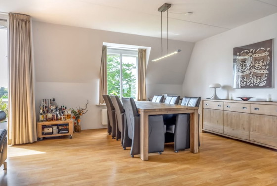 Deze prachtige eethoek van Henders & Hazel bestaat uit een stevige houten eettafel en zes comfortabele leren stoelen op wieltjes. De tafel heeft een afmeting van 160x100x77 cm en het blad kan een stukje worden ingeschoven, wat flexibiliteit biedt in gebruik. De stoelen zijn bekleed met hoogwaardig bruin leer, wat zorgt voor een luxe uitstraling en extra comfort. Deze set is ideaal voor gezellige diners en past perfect in een modern interieur. De set is in goede staat en wordt verkocht vanwege een verhuizing. Ophalen kan in Gouda.